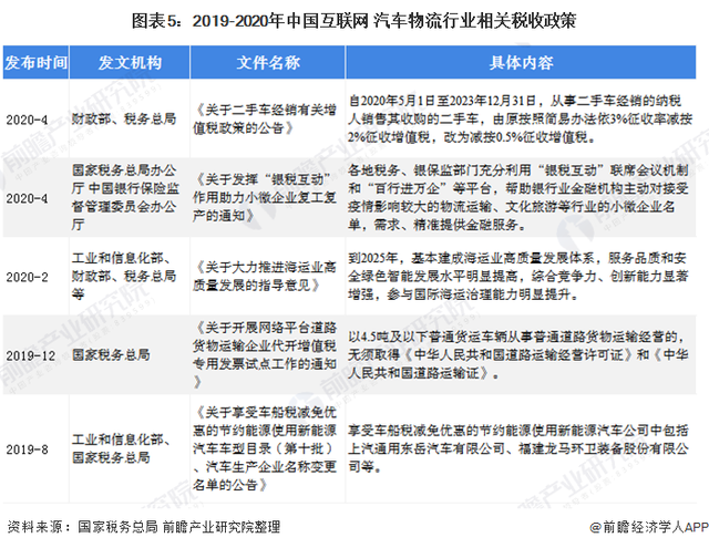 在稅收方面,國家政策對于汽車行業(yè)給予較大支持。2020年4月,《關(guān)于二手車經(jīng)銷有關(guān)增值稅政策的公告》指出,自2020年5月1日,二手車經(jīng)銷減按0.5%征收增值稅。二手車稅收的減征將有利于二手車銷售,推動二手車汽車物流發(fā)展?!蛾P(guān)于開展網(wǎng)絡(luò)平臺道路貨物運輸企業(yè)代開增值稅專用發(fā)票試點工作的通知》指出以4.5噸及以下普通貨運車輛從事普通道路貨物運輸經(jīng)營的,無須取得運輸經(jīng)營許可證和道路運輸證,一系列稅收和程序便利化政策推動網(wǎng)絡(luò)平臺道路貨物運輸企業(yè)發(fā)展。